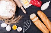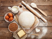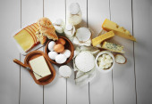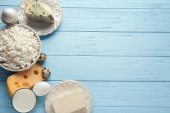 Martwa natura z produktów mlecznych i chleb na drewnianym stole
