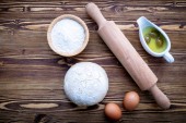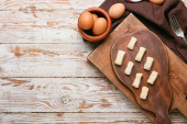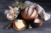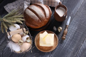 Martwa natura z produktów mlecznych i chleb na drewnianym stole