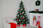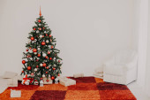 Wnętrze Nowego Roku w stylu poddasza z dużą choinką ozdobione i prezenty pod choinką