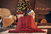 Kobieta w piżamie i skarpetki dekorowanie gałęzi choinki z zabawką w domu w pobliżu kominka.