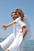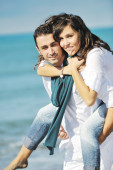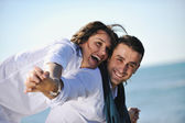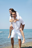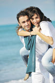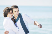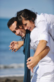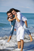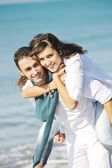 szczęśliwa rodzina bawi się z psem na plaży