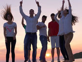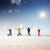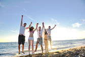 szczęśliwa rodzina bawi się z psem na plaży