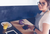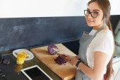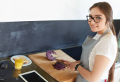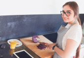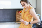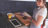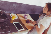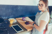 Młoda kobieta używa tabletu do gotowania w kuchni