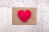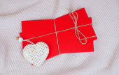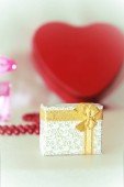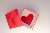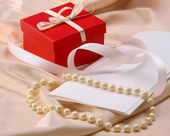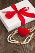 Czerwone pudełko, serce i perłowe koraliki zbliżenie na białym tle. Prezenty dla kobiety. Makieta, ostrość selektywna