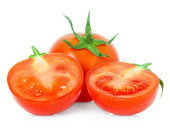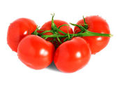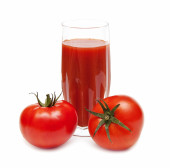 picie szklanki z soku pomidorowego i dojrzałych świeżych pomidorów w pobliżu na białym tle na białym tle