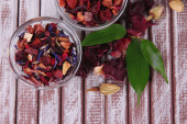 Aromatyczne herbaty suche w kręgle drewniane tła