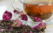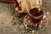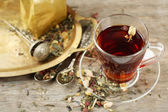Filiżanka herbaty z aromatycznych suchej herbaty na drewniane tła