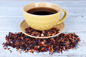 Filiżanka herbaty z aromatycznych suchej herbaty w kręgle drewniane tła