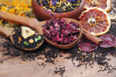 filiżanka herbaty z aromatycznych suchej herbaty na drewniany stojak z bliska