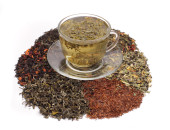 filiżanka herbaty z aromatyczne herbaty suchej miski na białym tle
