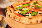 Cienka pizza ze świeżymi liśćmi bazylii. Kawałki pizzy. Domowe jedzenie. Włoska wegetariańska pizza. Koncepcja smacznego i obfitego posiłku. Rustykalne drewniane tło.