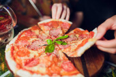 Zdjęcie "Cienka pizza ze świeżymi liśćmi bazylii. Kawałki pizzy. Domowe jedzenie. Włoska wegetariańska pizza. Koncepcja smacznego i obfitego posiłku. Rustykalne drewniane tło." może być wykorzystywane do celów osobistych i komercyjnych zgodnie z warunkami zakupionej licencji Royalty-free. Obraz jest dostępny do pobrania w jakości wysokiej rozdzielczości do 5760x3840.