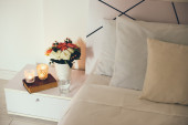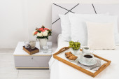 kubki kawy na wygodnym łóżku miękkie poduszki