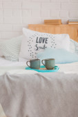 kubki kawy na wygodnym łóżku miękkie poduszki