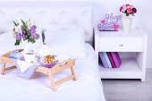 kubki kawy na wygodnym łóżku miękkie poduszki