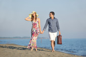 szczęśliwa rodzina bawi się z psem na plaży