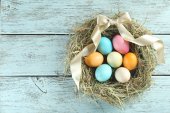 Pisanki w gnieździe na kolorowym drewnianym tle