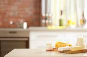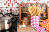 proces przygotowywania makaronu. Kompozycja z wiersza spaghetti w patelni, tarka, sera, na drewnianym stole na jasnym tle