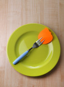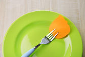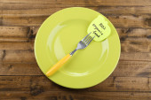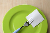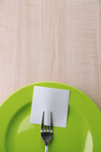 pusta notatka papier dołączone do stołu, na talerzu, drewniane tła kolor