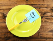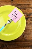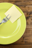 papier firmowy z wiadomości dołączone do stołu, na talerzu, drewniane tła kolor