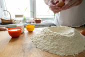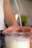 Dłoń kobiety wlewa mleko do miski. Przygotowanie ciasta na pierogi. Przepis krok po kroku do ciasta, pierogi.