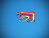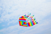 Zdjęcie "Latawiec na tle błękitnego nieba o zachodzie słońca w słoneczny dzień latem. Kolorowy latawiec z wieszakiem w powietrzu. Miejski festiwal latawców. Ogon latawca kołysze się na wietrze. Dzieciństwo. Wolność. Zabawka. Spokojnie." może być wykorzystywane do celów osobistych i komercyjnych zgodnie z warunkami zakupionej licencji Royalty-free. Obraz jest dostępny do pobrania w jakości wysokiej rozdzielczości do 5760x3840.
