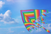 Latawiec na tle błękitnego nieba o zachodzie słońca w słoneczny dzień latem. Kolorowy latawiec z wieszakiem w powietrzu. Miejski festiwal latawców. Ogon latawca kołysze się na wietrze. Dzieciństwo. Wolność. Zabawka. Spokojnie.