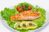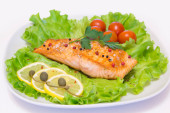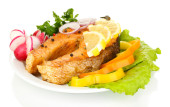 smaczny łosoś z grilla z warzywami, na białym tle