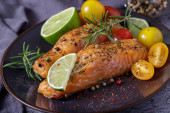smaczny łosoś z grilla z warzywami, z bliska