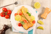 smaczny łosoś z grilla z warzywami, na drewnianym stole