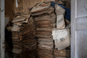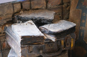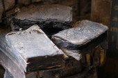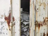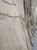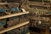 prześcieradła i kawałki rozdartego worka wiszące na ścianach. Wysokiej jakości zdjęcie