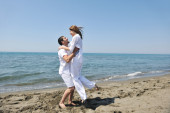 szczęśliwa rodzina bawi się z psem na plaży