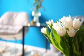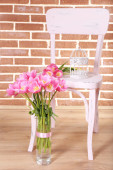 Piękne różowe tulipany na szarym tle ściany