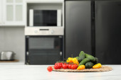 Różne świeże warzywa i grzyby na białym stole w nowoczesnej kuchni. Miejsce na tekst