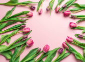 Tulipany na różowym tle ułożone w kształcie serca z miejscem na tekst lub wstawić inny obiekt. Harmonia i kardiologia. Ramka z przestrzenią do kopiowania.