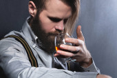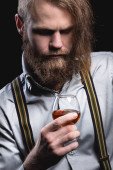 Stylowy brodaty mężczyzna w koszuli z szelkami wącha szklankę whisky. portret pracowni