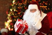 Święty Mikołaj spoczywa w pobliżu urządzonego kominka w pomieszczeniach