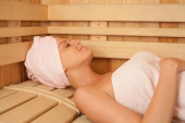 Kobieta, leżąc z zamkniętymi oczami w łaźni parowej