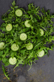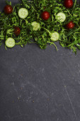 Świeże warzywa rukola, pomidor, ogórek, zioła, papryka i oliwki na szarym tle. Widok z góry. Miejsce na tekst, miejsce na kopię.