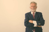 Profil widok szczęśliwy starszy brodaty biznesmen uśmiecha się pokazując coś na białym tle