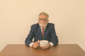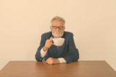 Studio shot przystojnego starszego brodatego biznesmena myśląc i trzymając filiżankę kawy siedząc na drewnianym stole na białym tle