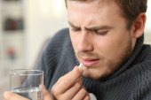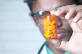 smutny człowiek trzyma pojemnik na pigułki, selektywne skupienie