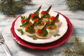 Zdjęcie "Kanapki z solonym śledziem, serem, przepiórczymi jajkami i pomidorami wiśniowymi na grzankach żytnich i filiżanką kawy na ciemnym tle. Format poziomy" może być wykorzystywane do celów osobistych i komercyjnych zgodnie z warunkami zakupionej licencji Royalty-free. Obraz jest dostępny do pobrania w jakości wysokiej rozdzielczości do 5760x3840.