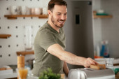 Zdjęcie "Młody mężczyzna w stroju domowym stojący w kuchni z filiżanką kawy w dłoni" może być wykorzystywane do celów osobistych i komercyjnych zgodnie z warunkami zakupionej licencji Royalty-free. Obraz jest dostępny do pobrania w jakości wysokiej rozdzielczości do 5760x3840.