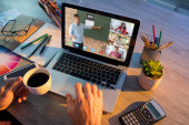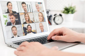 Zdjęcie "Wideokonferencja z wieloma pracownikami. Aplikacja Laptop do zdalnej pracy i nauki z domu. Baner internetowy z przestrzenią do kopiowania" może być wykorzystywane do celów osobistych i komercyjnych zgodnie z warunkami zakupionej licencji Royalty-free. Obraz jest dostępny do pobrania w jakości wysokiej rozdzielczości do 5760x3840.