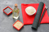 Skład z octem ryżowym na drewnianym tle