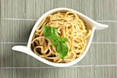 Talerz z smacznym makaronem i sosem pesto na białym tle