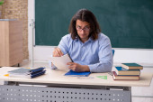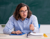 Zdjęcie "Młody nauczyciel przed zieloną tablicą" może być wykorzystywane do celów osobistych i komercyjnych zgodnie z warunkami zakupionej licencji Royalty-free. Obraz jest dostępny do pobrania w jakości wysokiej rozdzielczości do 5760x3840.