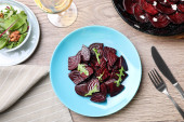 Zdjęcie "Pieczone plasterki buraków z serem feta i rukolą na jasnoszarym stole, widok z góry. Miejsce na tekst" może być wykorzystywane do celów osobistych i komercyjnych zgodnie z warunkami zakupionej licencji Royalty-free. Obraz jest dostępny do pobrania w jakości wysokiej rozdzielczości do 5760x3840.