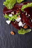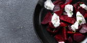 Pieczone plasterki buraków z serem feta i rukolą na jasnoszarym stole, widok z góry. Miejsce na tekst